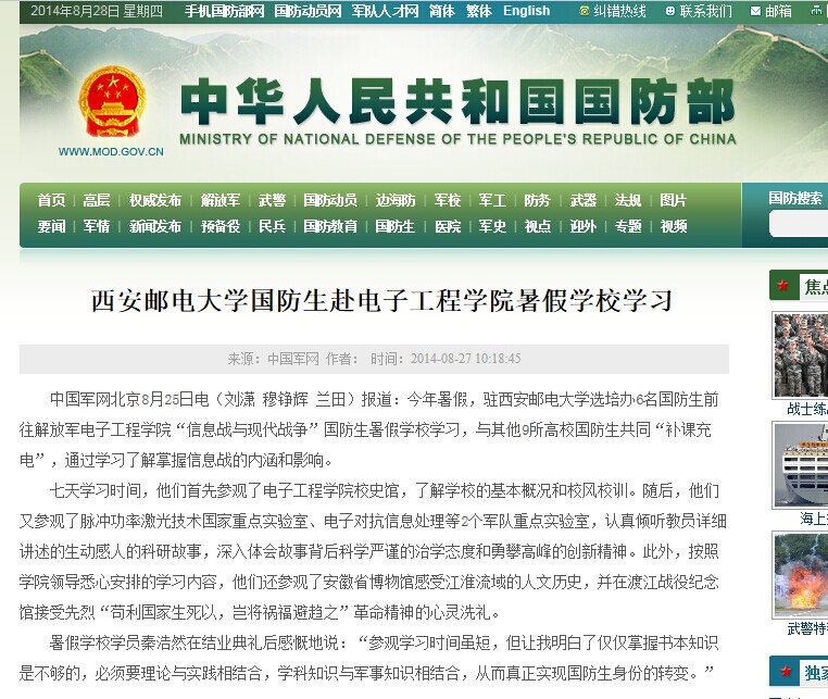 相关链接:http://www.mod.gov.cn/cadets/2014-08/27/content_4532772.htm