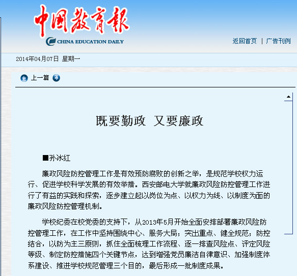 通过广泛宣传和全员参与,全校上下廉政风气空前浓厚,党员领导干部的风险意识、自律意识和责任意识在学习和感悟中不断增强。大家从被动接受这一管理模式,到主动《识风险、订制度、重执行》,把遵守廉政风险管理作为自我教育的一种方法手段,达到了自觉防控目的,“既要勤政,又要廉政”的“一岗双责”要求得以有效落实。(孙冰红 作者系kaiyun登录中国入口登录纪委书记)