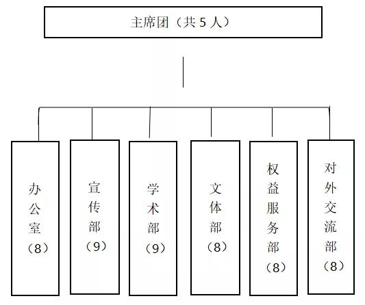 研究生会组织架构为“主席团+工作部门”模式。探索实行轮值制度,设执行主席,由主席团轮值担任,以学期为一个轮值周期,执行主席负责召集会议、牵头日常工作。